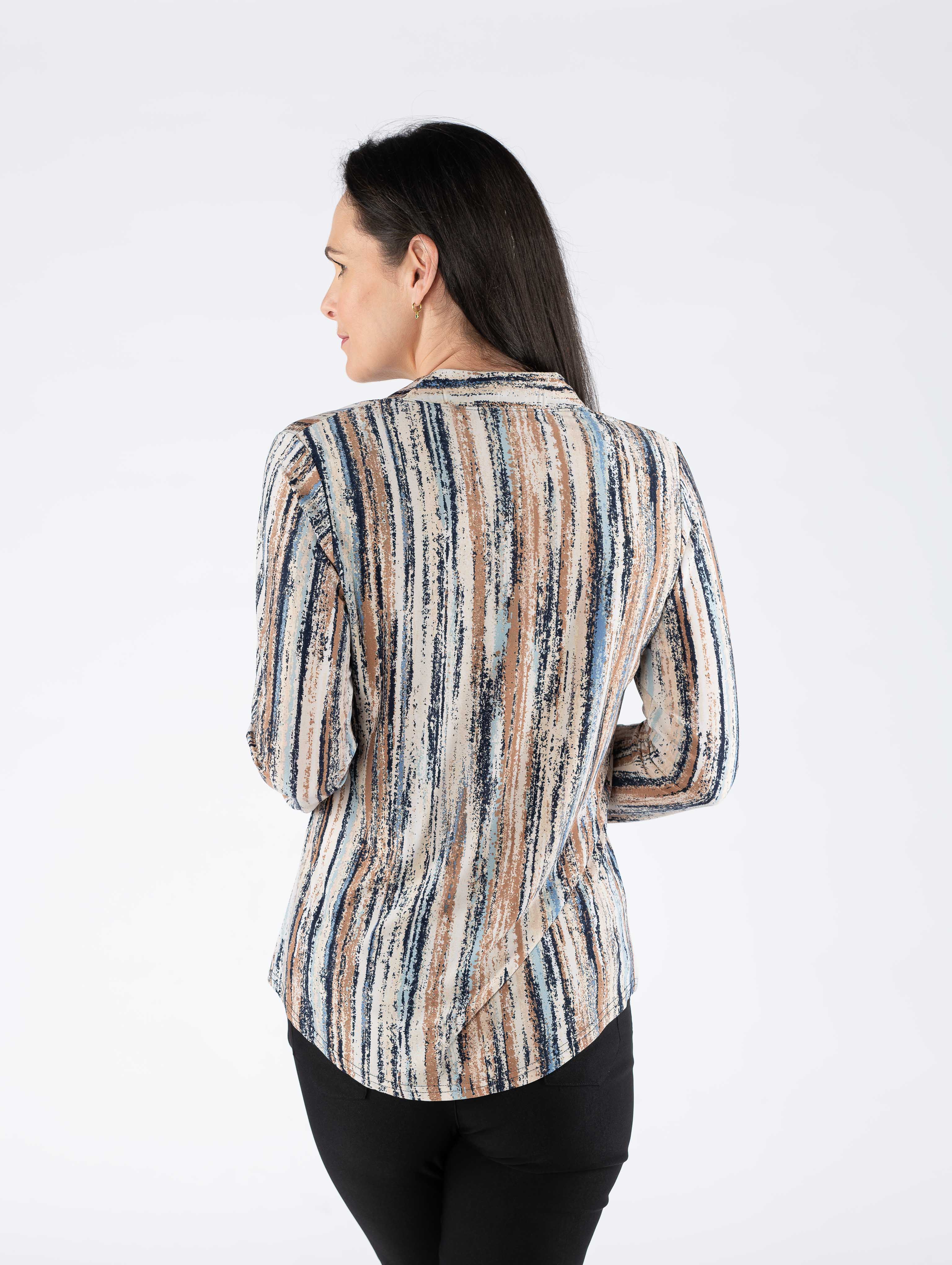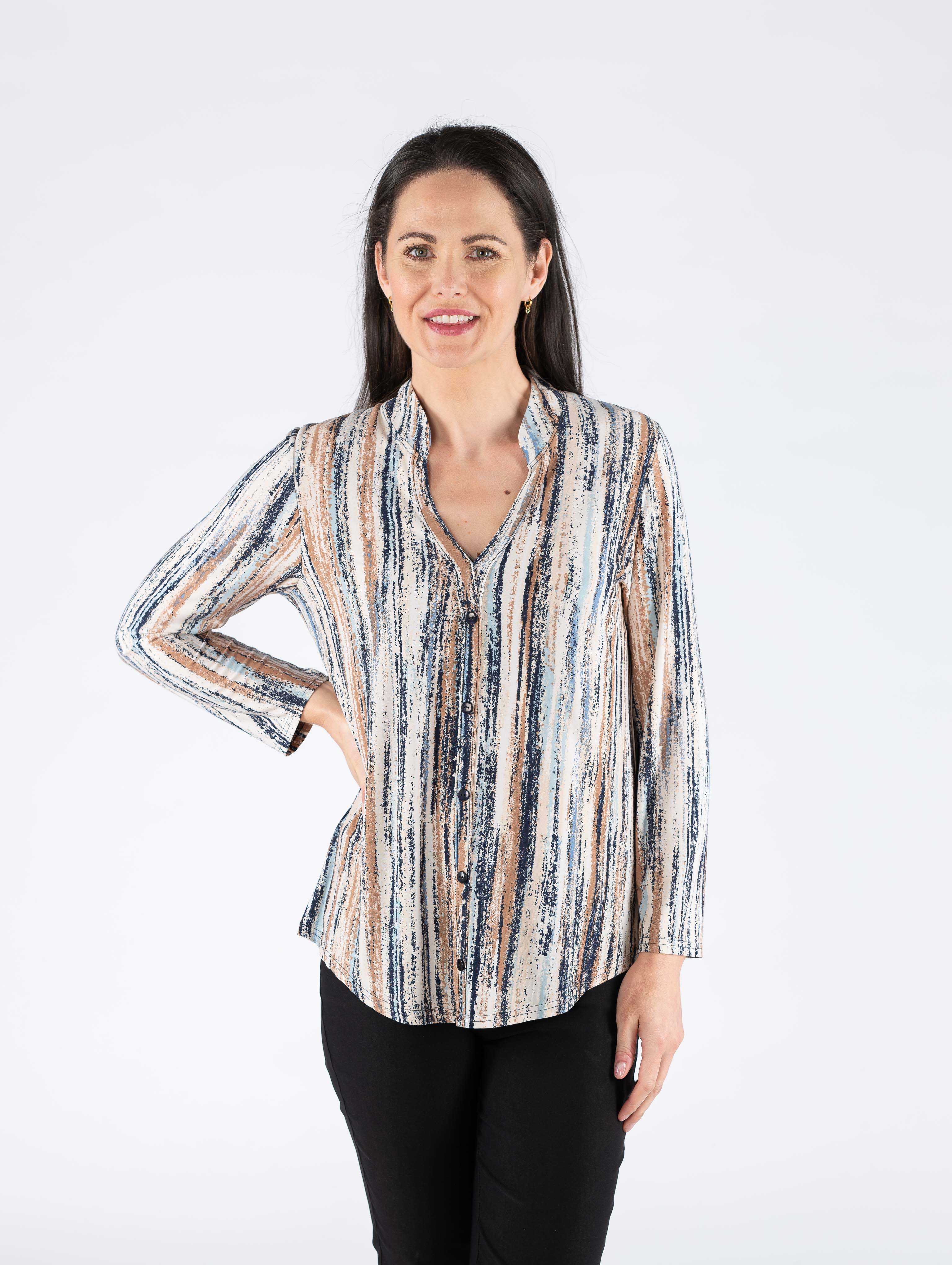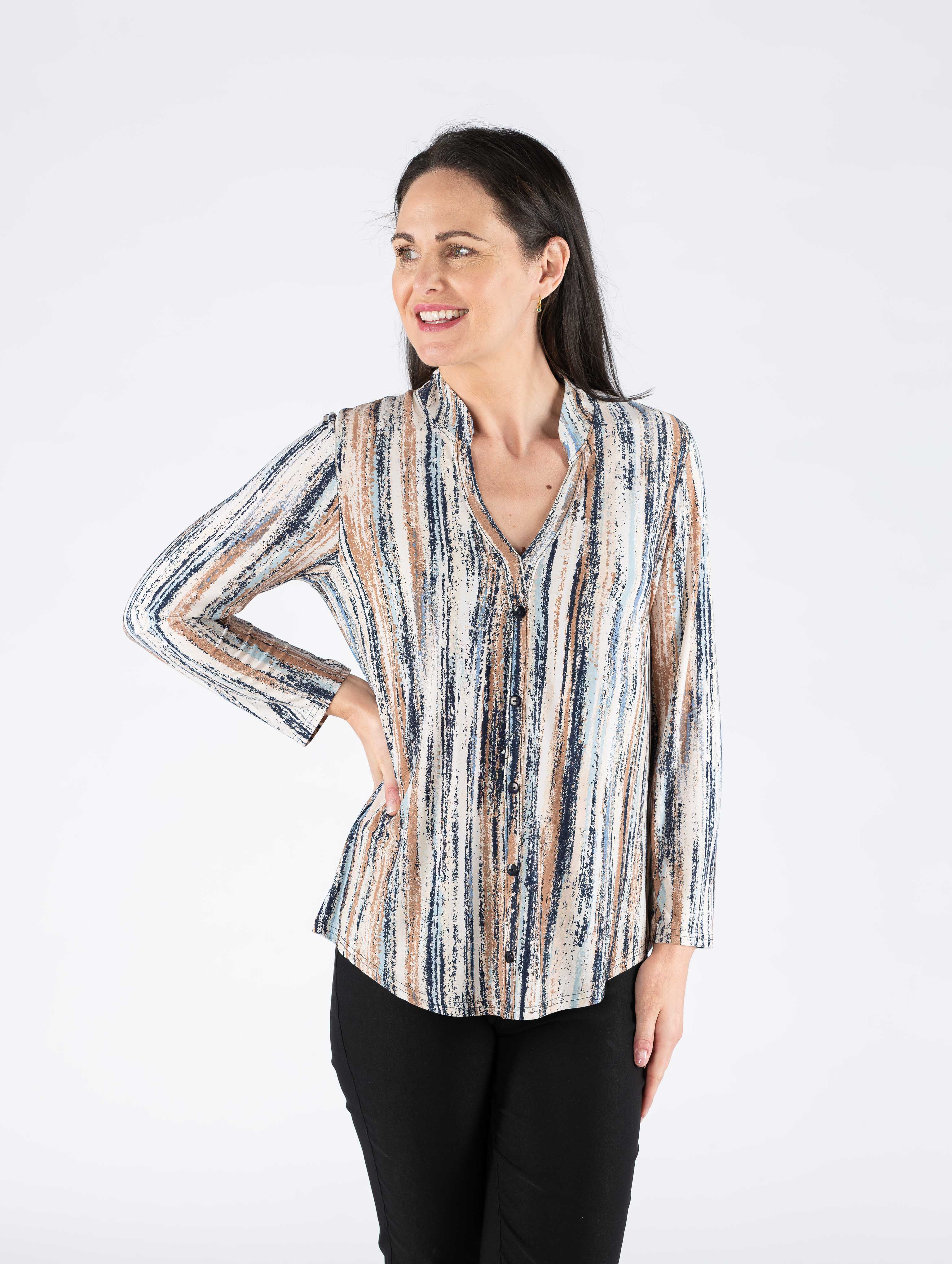 BEIGE MULTI STRIP PRINT TOP WITH BUTTON PLACKET