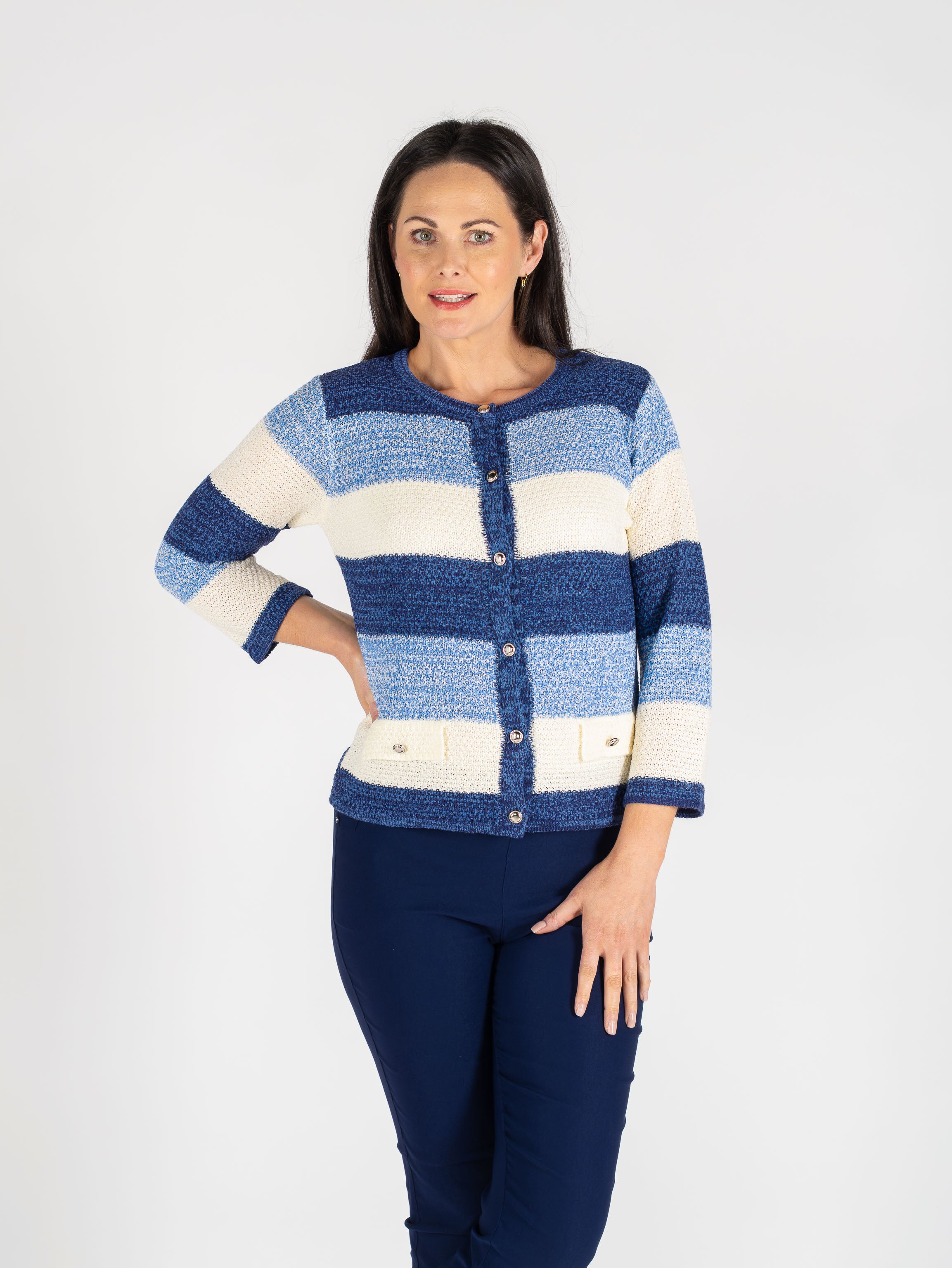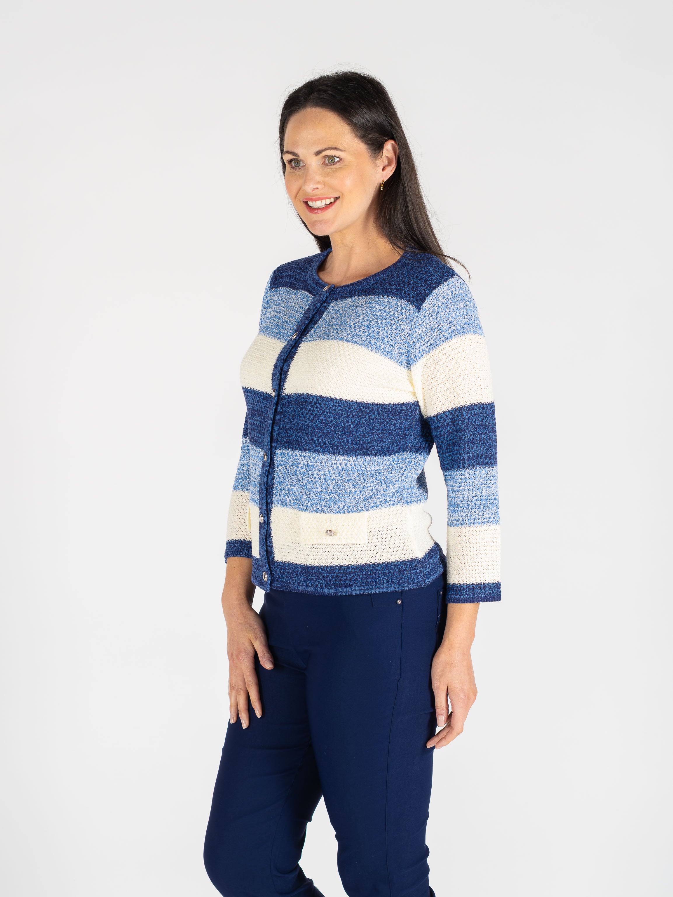 Brighten up your knitwear collection with this blue multi stripe cardigan. Designed with practical pocket detailing and flattering 3/4 length sleeves, it’s a perfect layering piece for everyday wear. Crafted from a soft acrylic–polyamide blend, it offers comfort, warmth, and easy-care practicality.