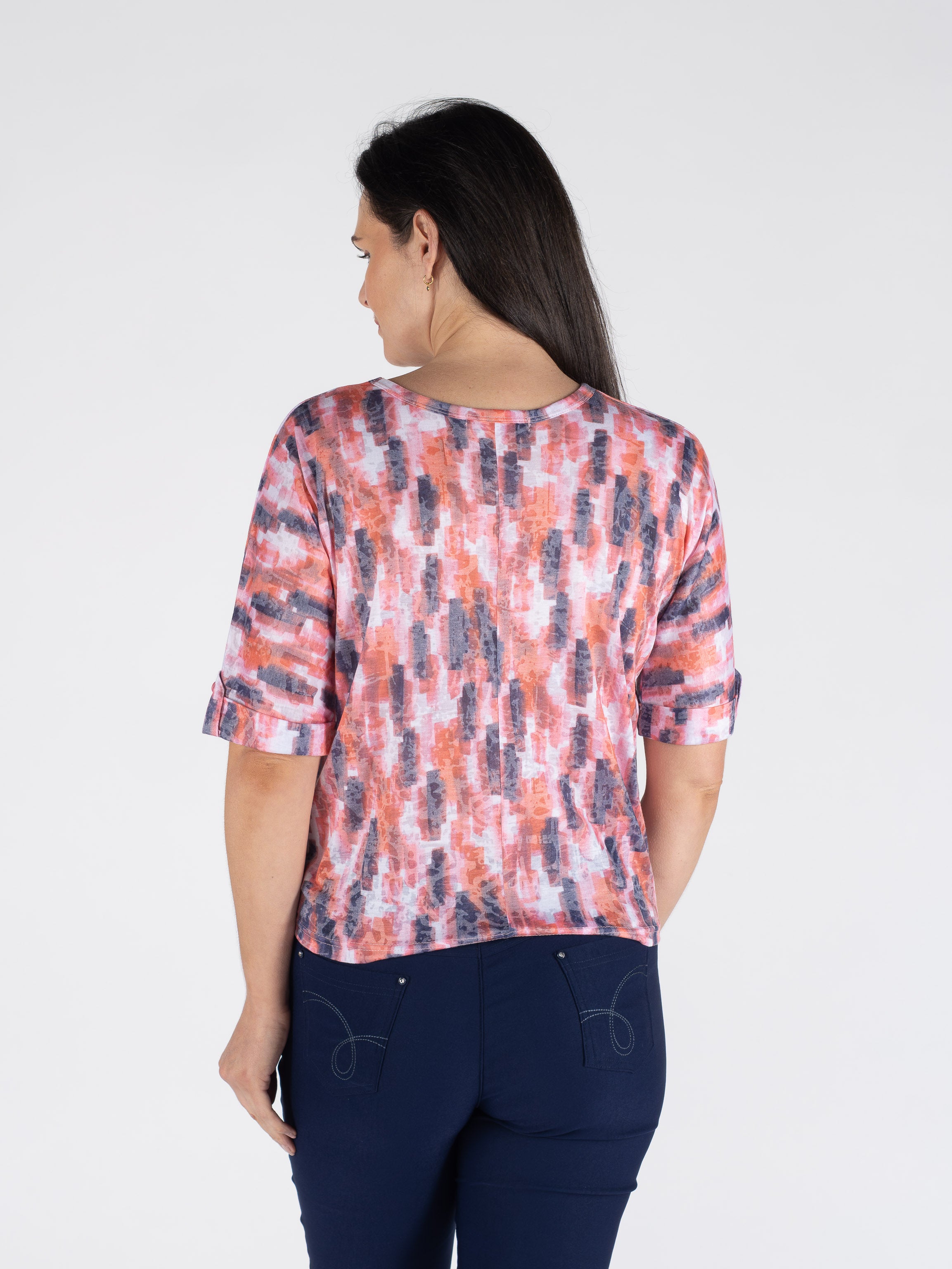 A vibrant coral multi block print top designed to add effortless charm to your everyday wardrobe. The flattering tie-front detail and breezy short sleeves create a stylish yet comfortable look. Crafted from a soft polyester-cotton blend for easy wear throughout the day.