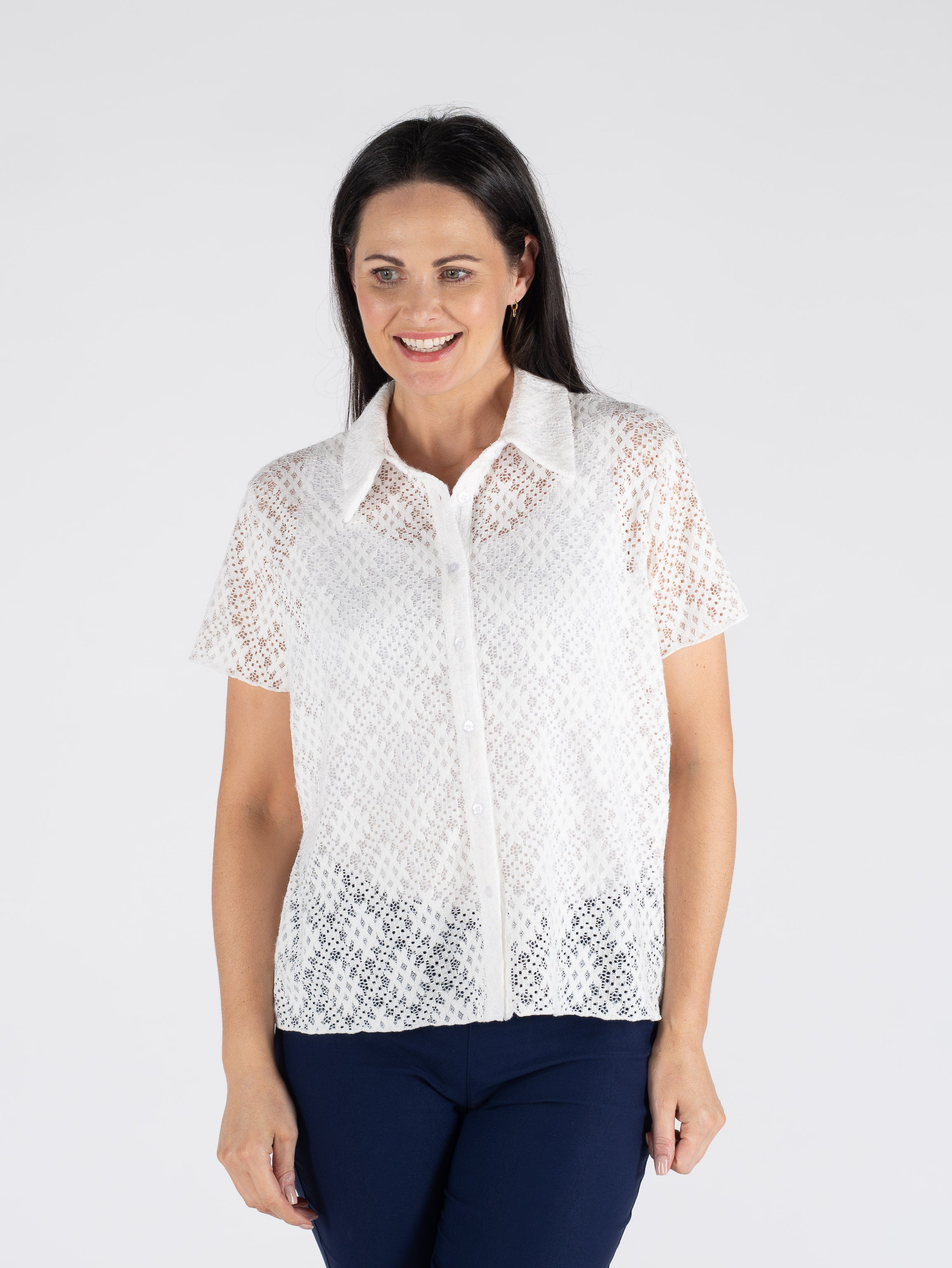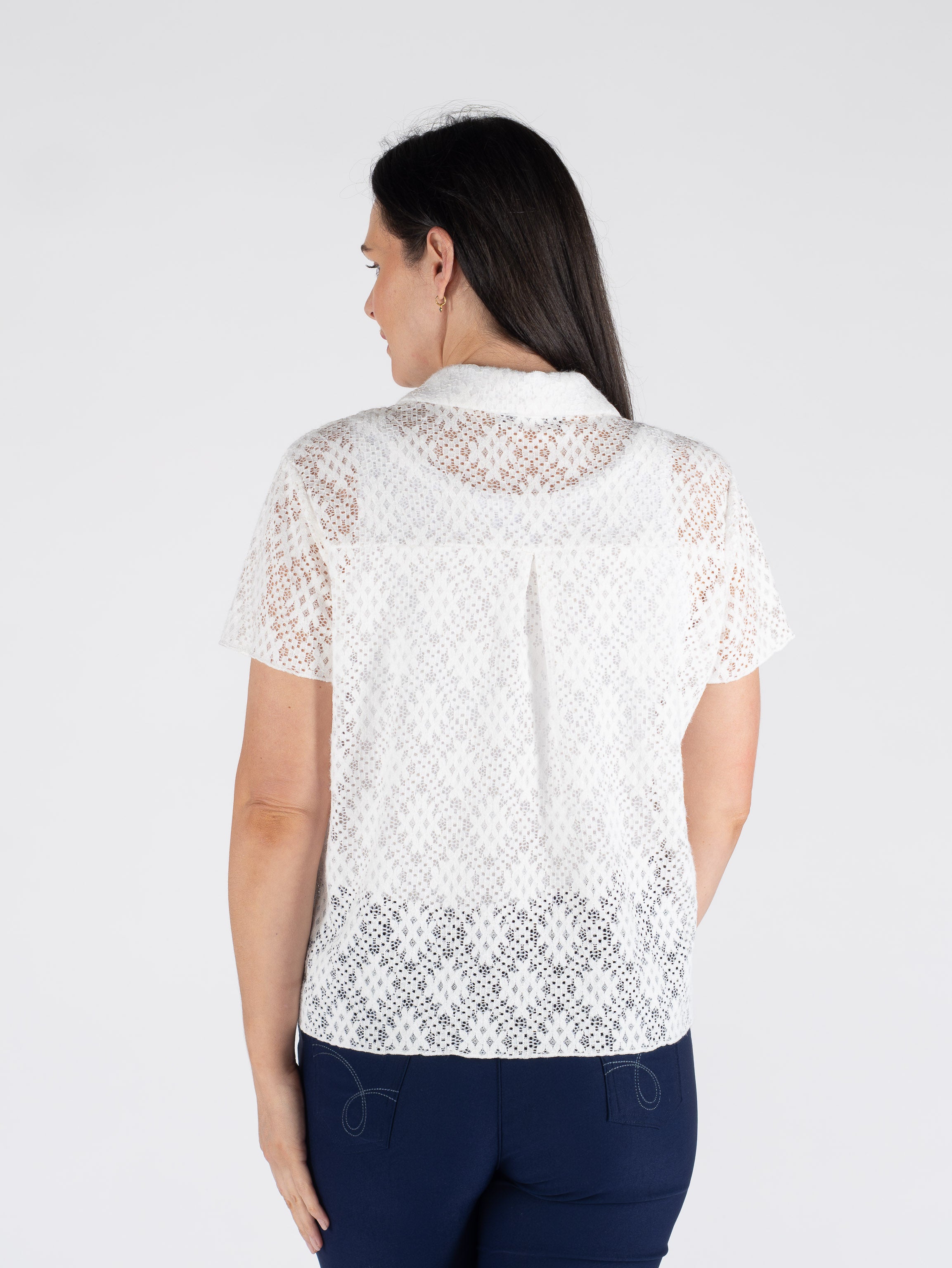 Elevate your wardrobe with this chic criss-cross lace blouse, where delicate detailing meets modern sophistication. The structured collar and short sleeves create a polished silhouette, perfect for both office settings and weekend outings.