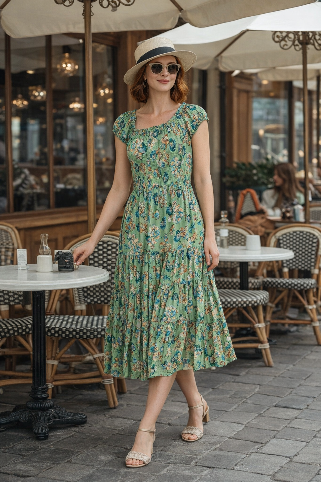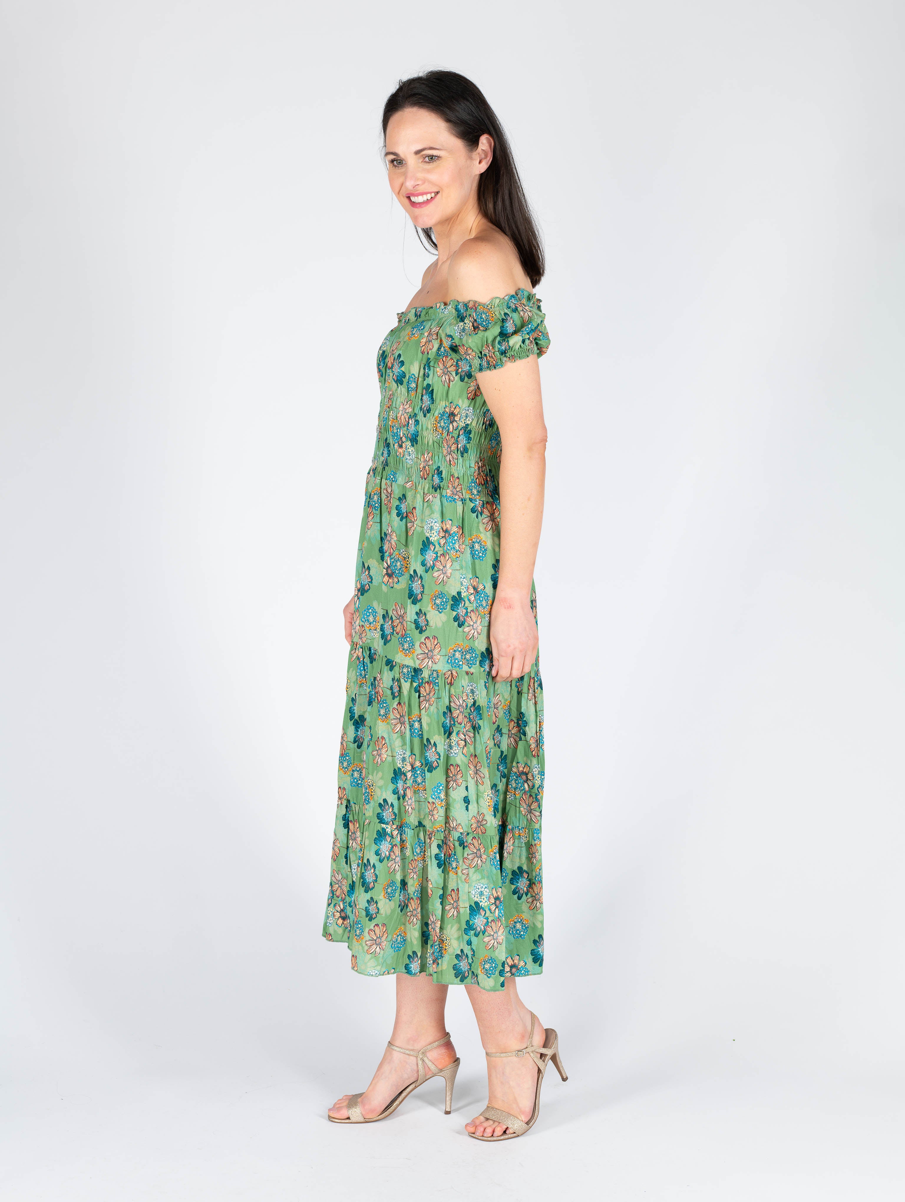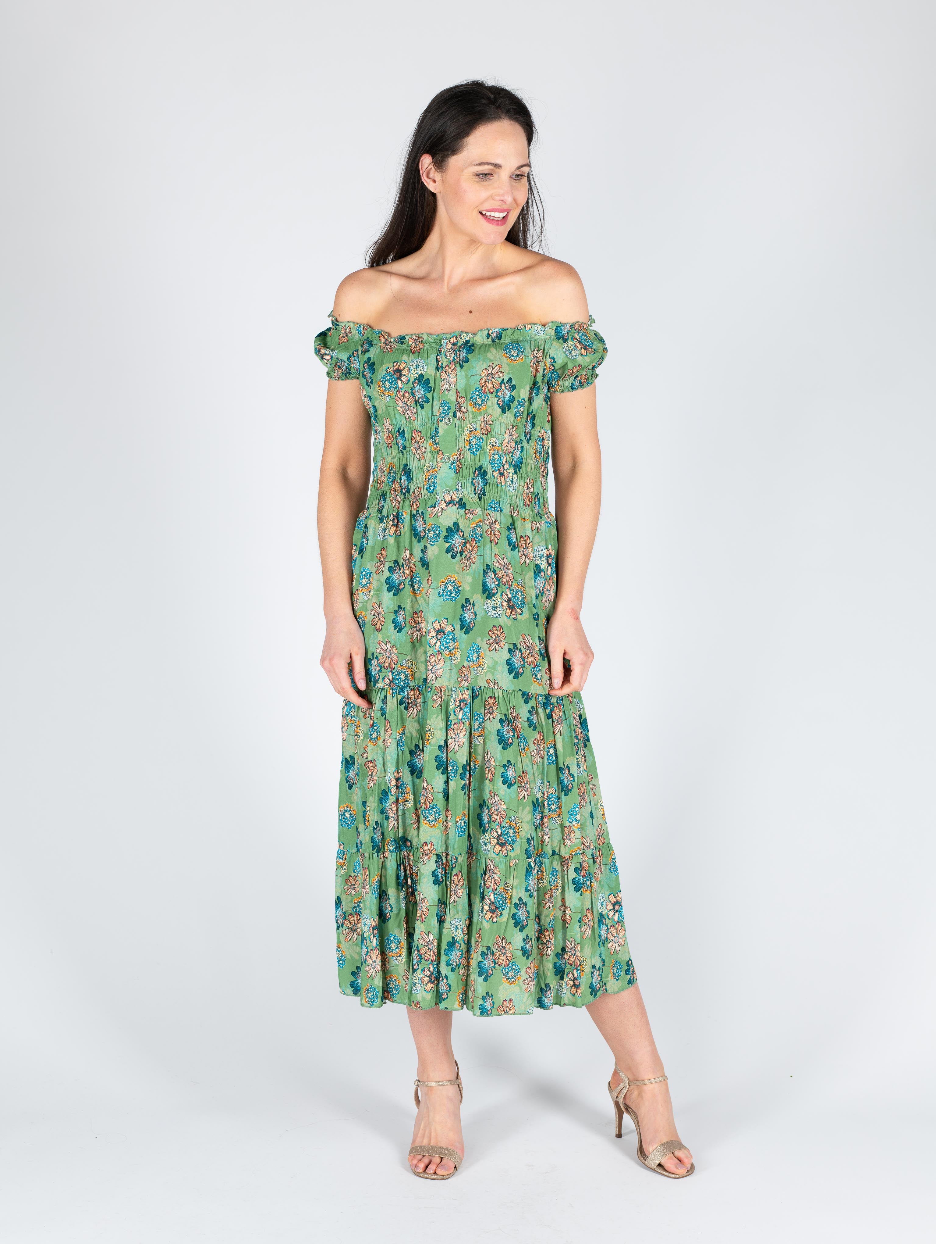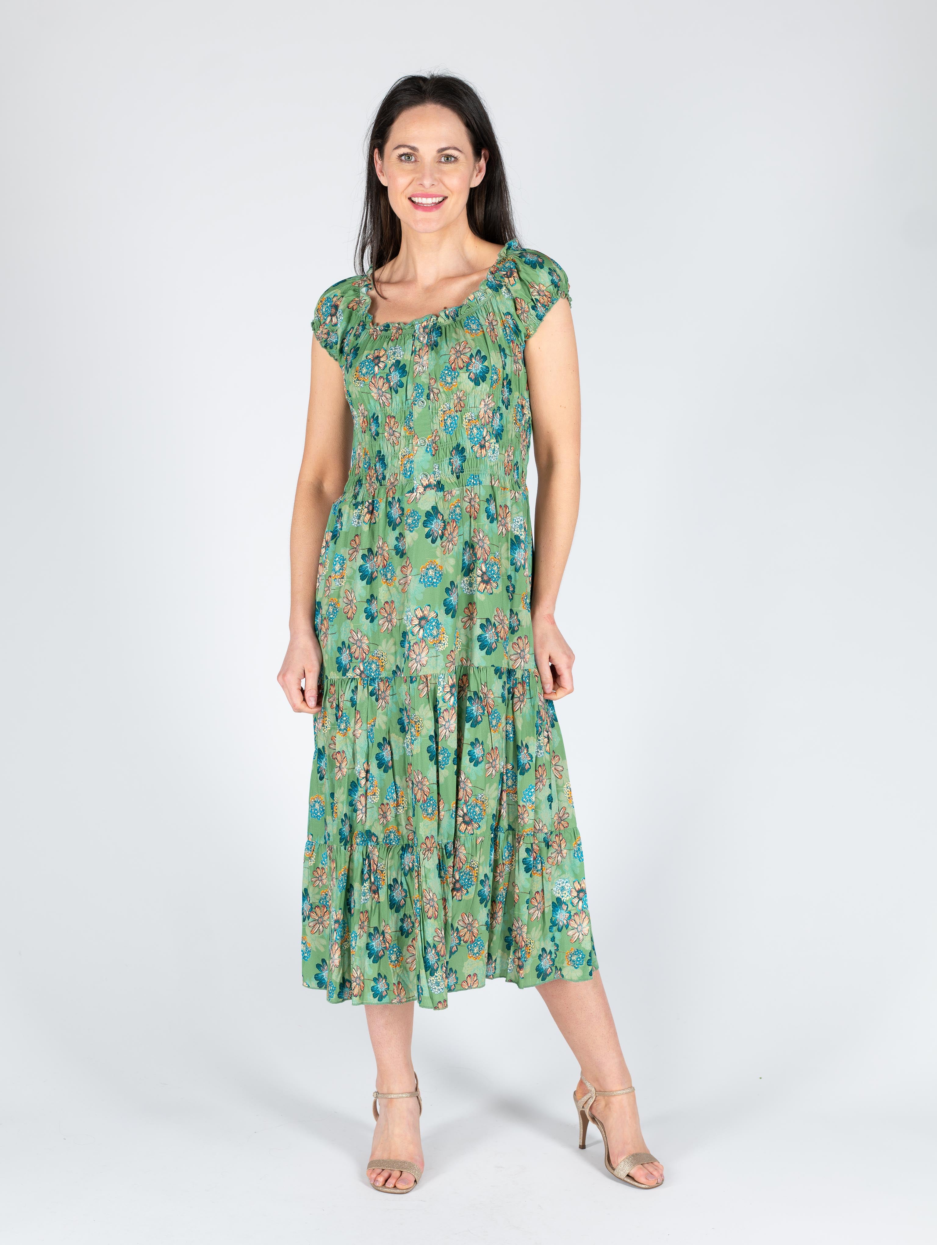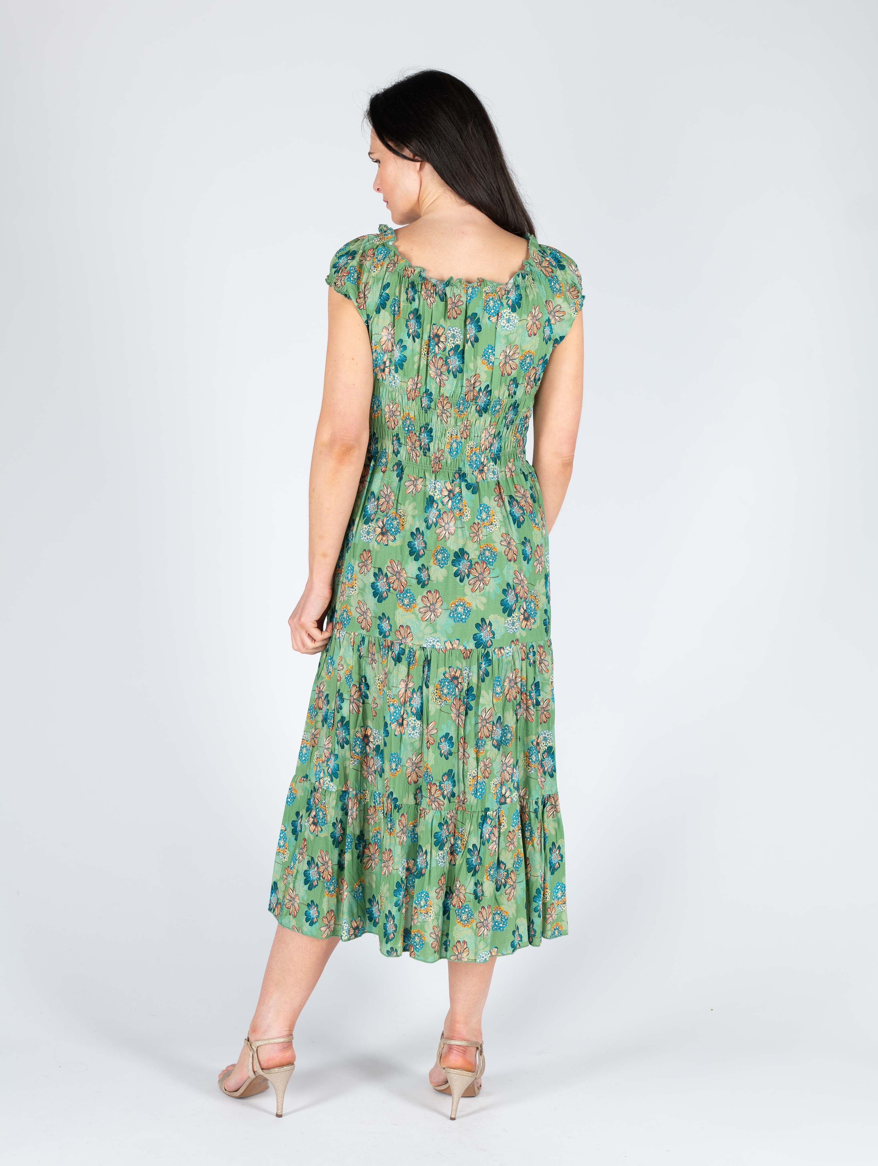 GREEN FLORAL PRINT GATHERED NECKLINE DRESS CAP SLEEVE
