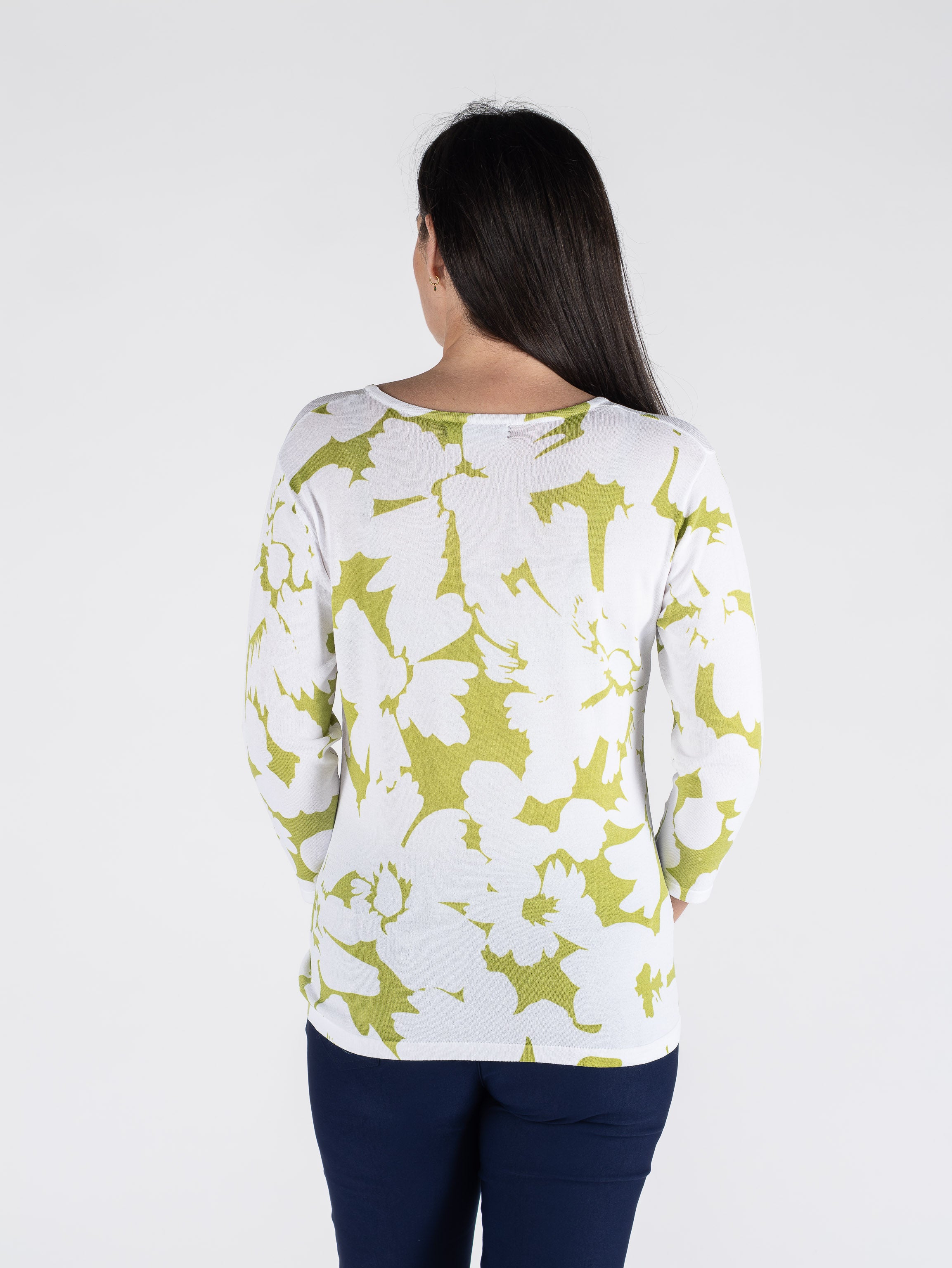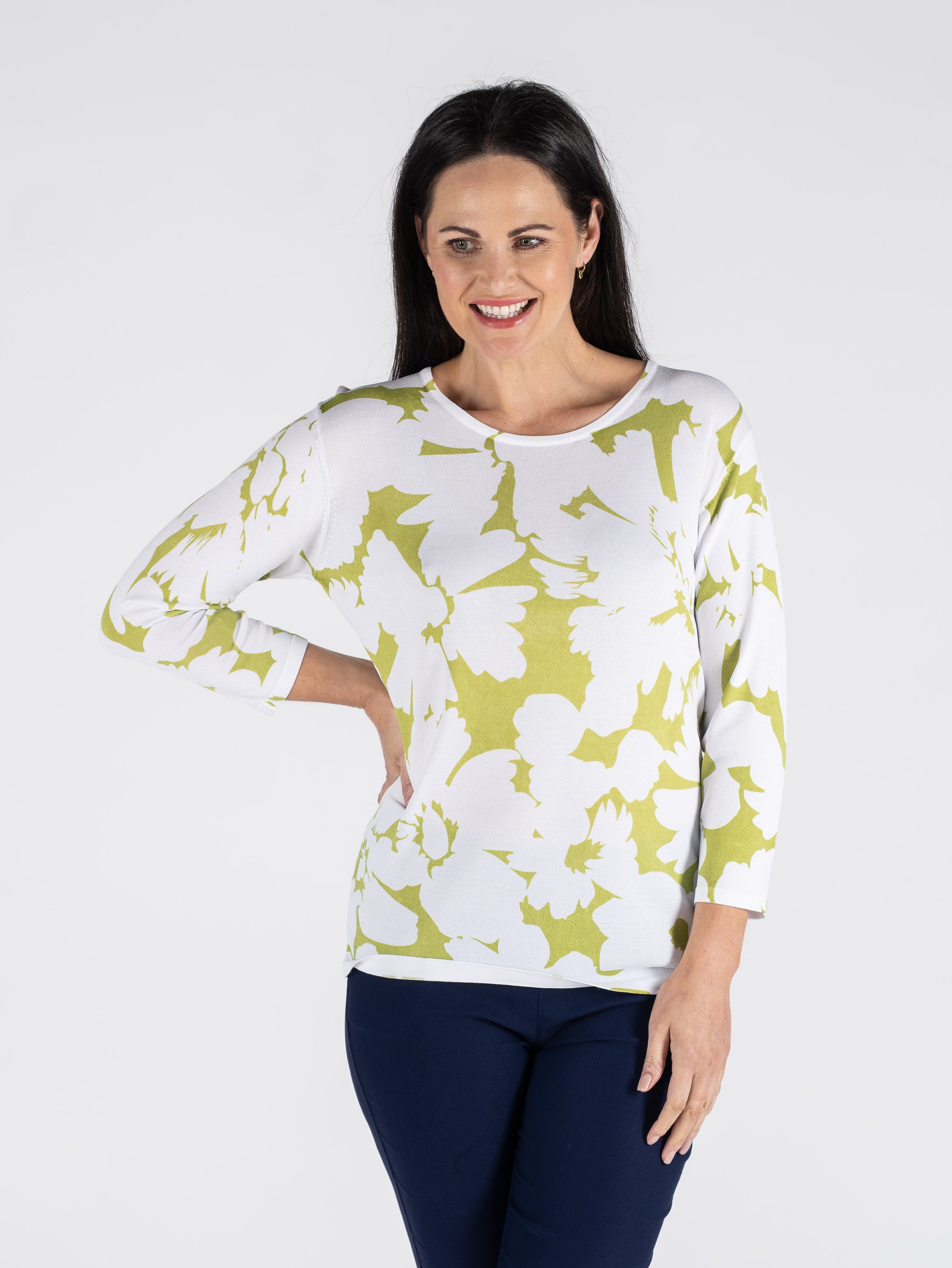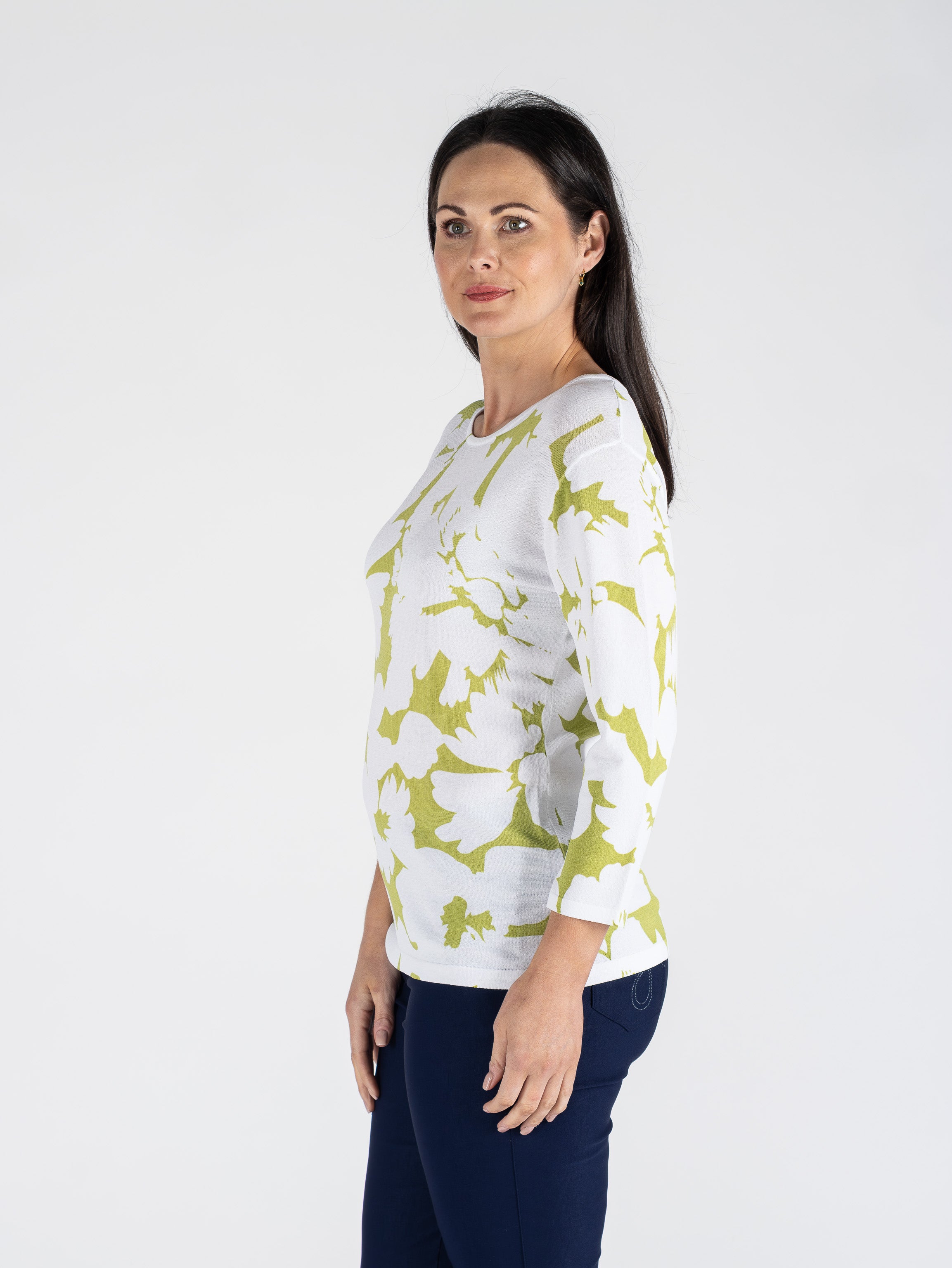 GREEN PRINT Flower Print Top 3/4 Sleeve Without Stone
