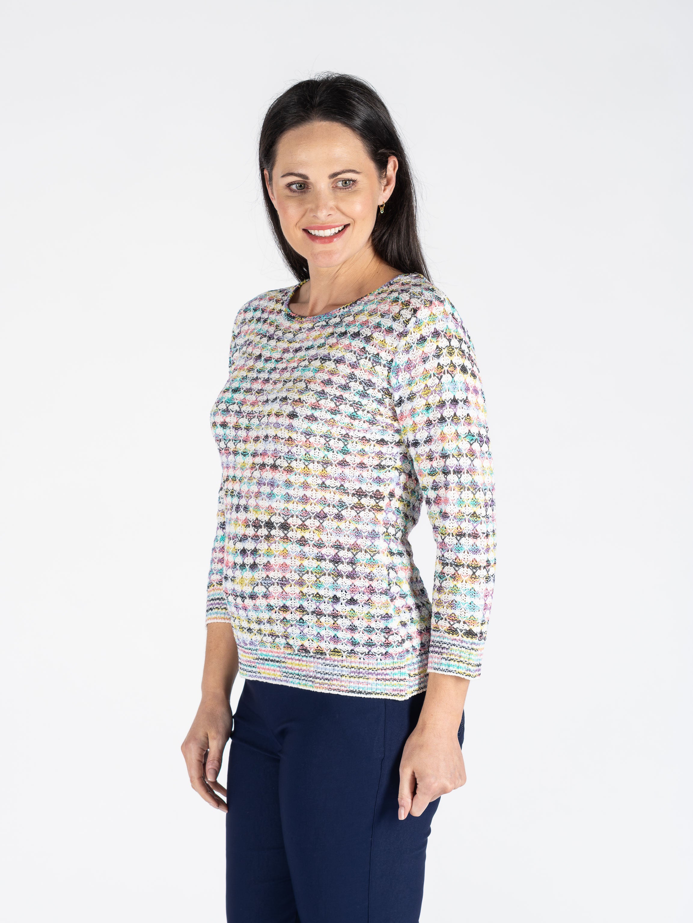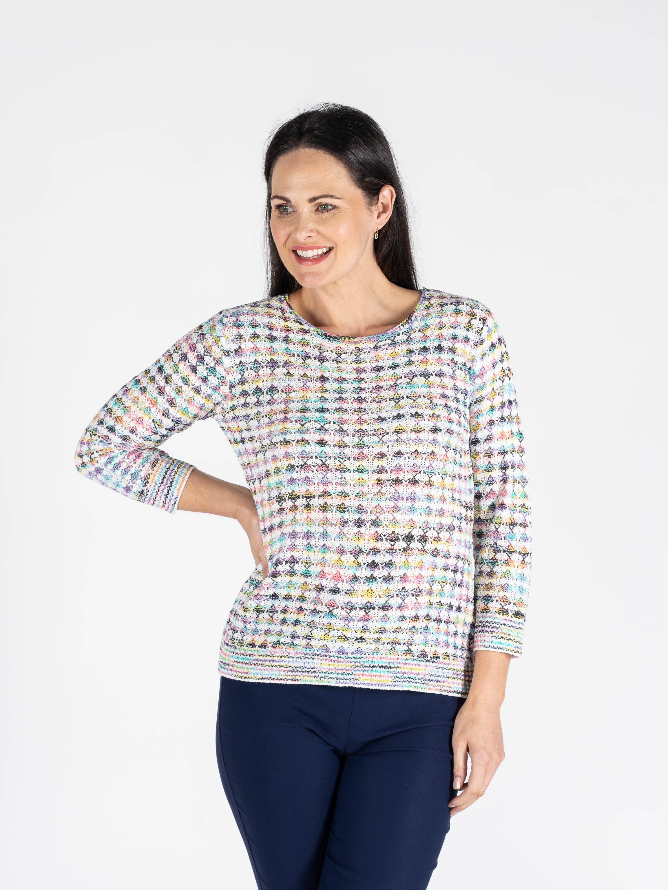 MULTI COLOR TAPE YARN JUMPER 3/4 SLEEVE