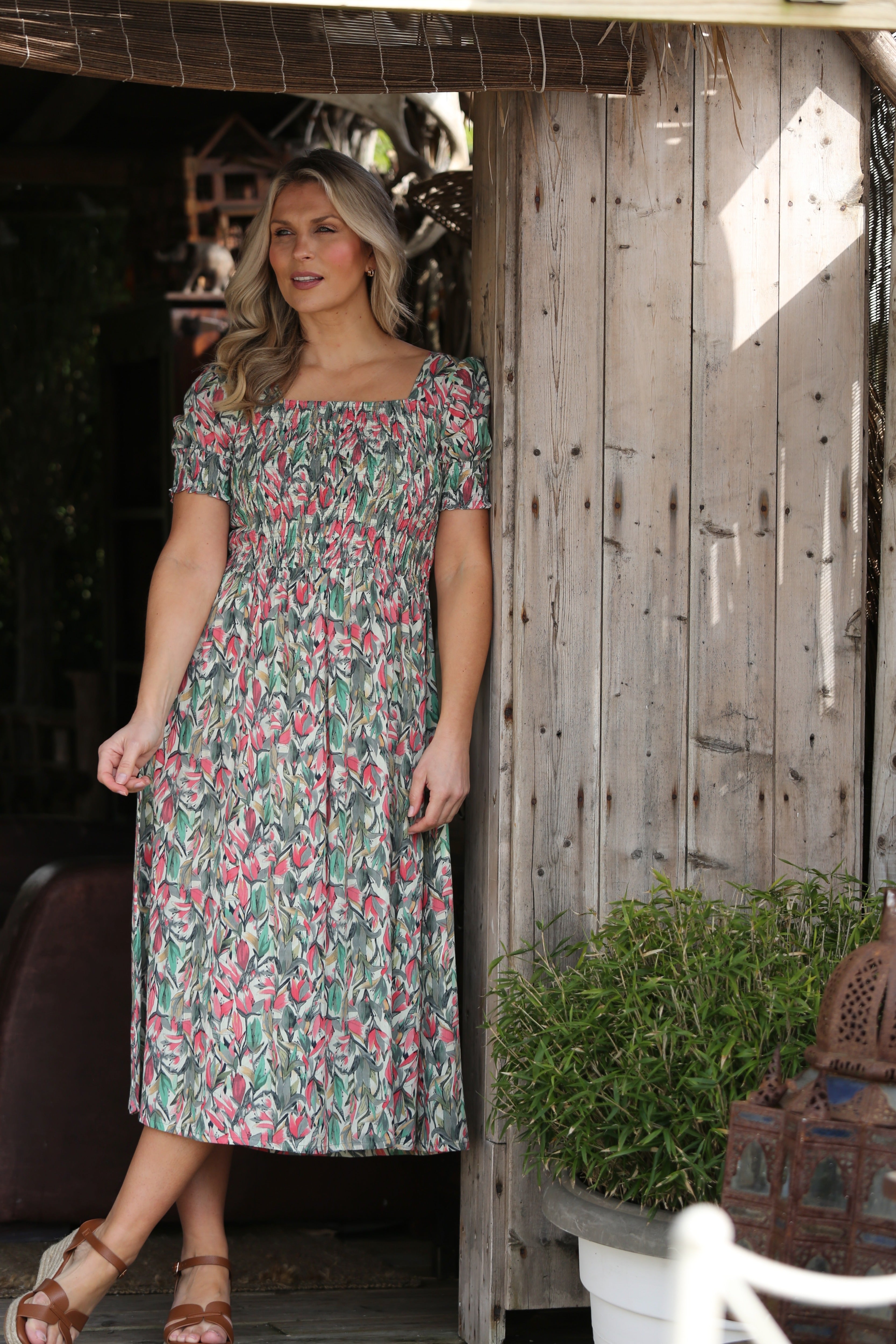 MULTI PRINT SQUARE NECK FLORAL PRINT CRINKLE DRESS