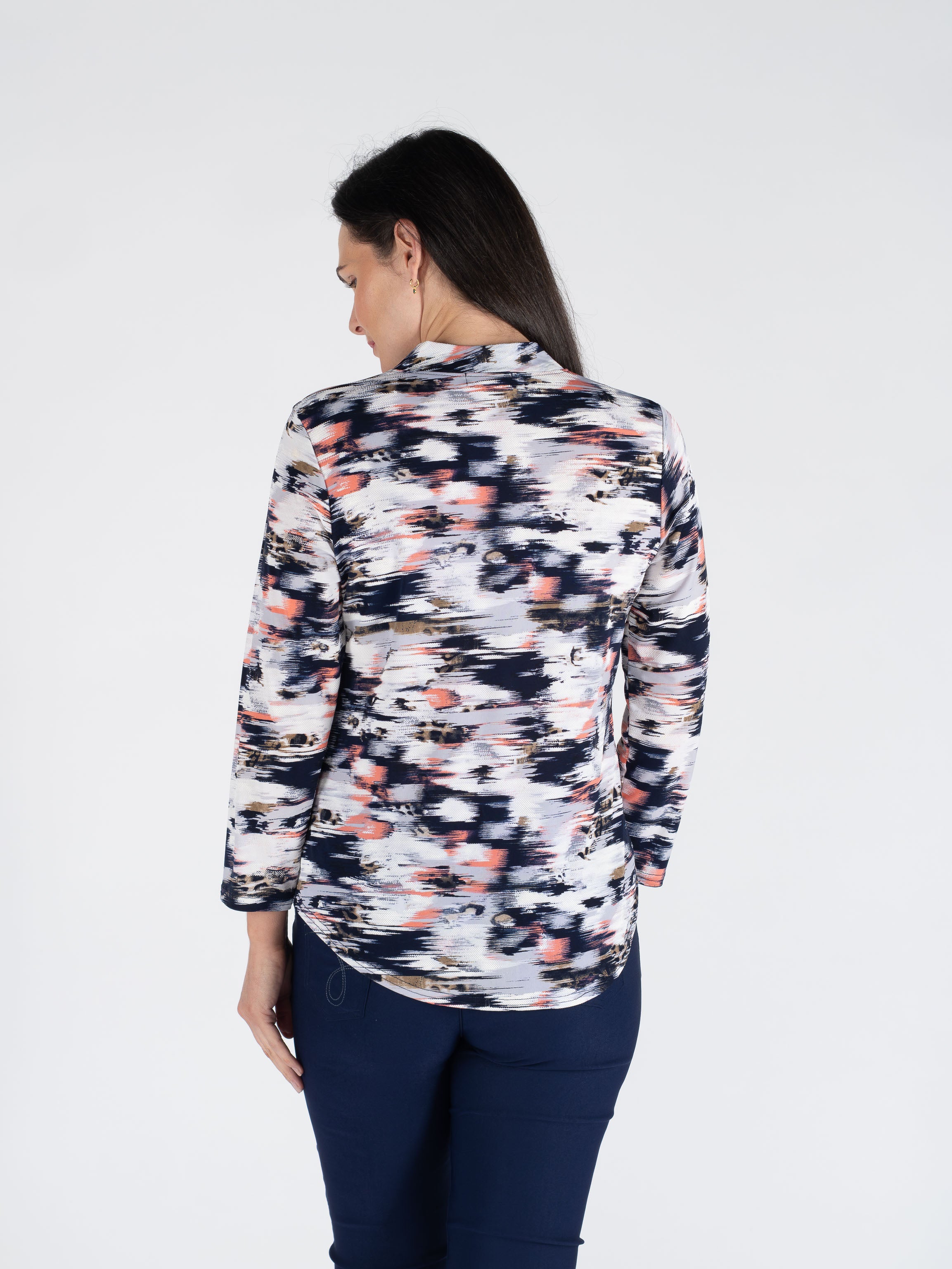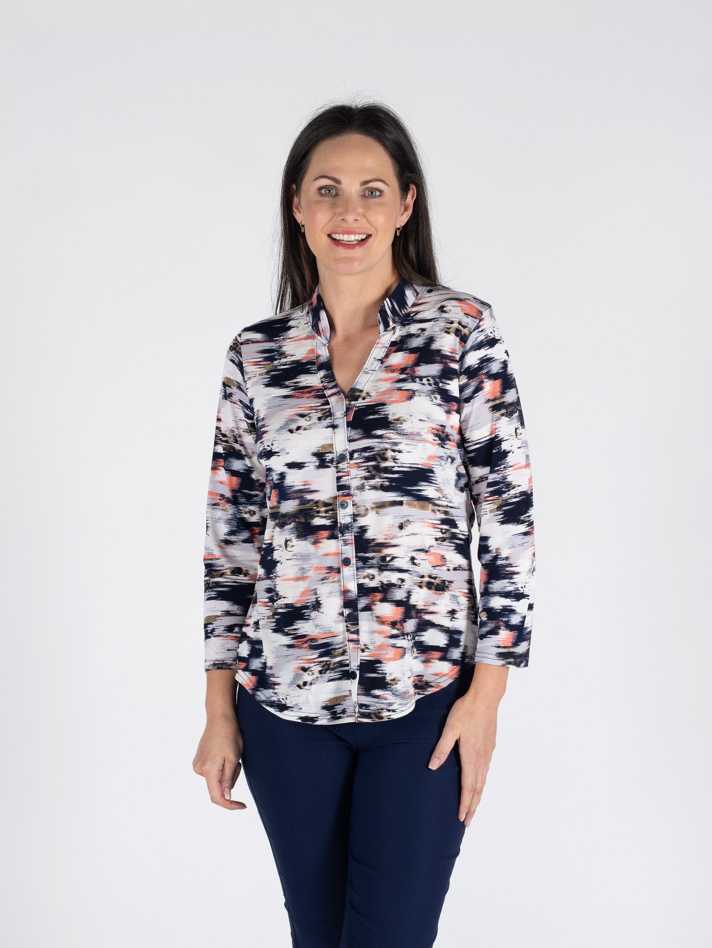 PEACH PRINT TOP WITH BUTTON PLACKET 3/4 SLEEVE