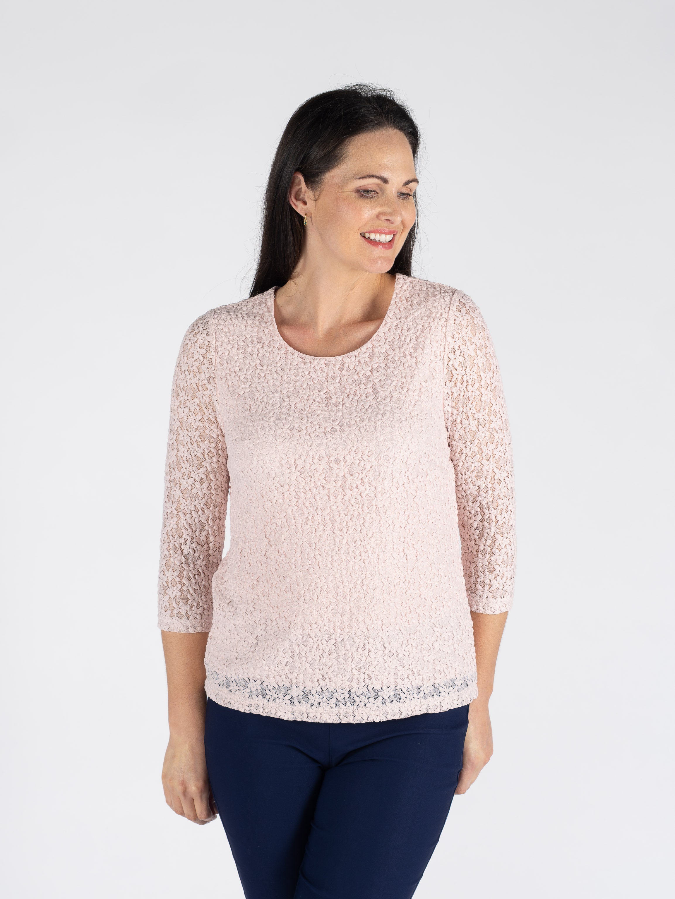PINK ROUND NECK LACE TOP 3/4 SLEEVE