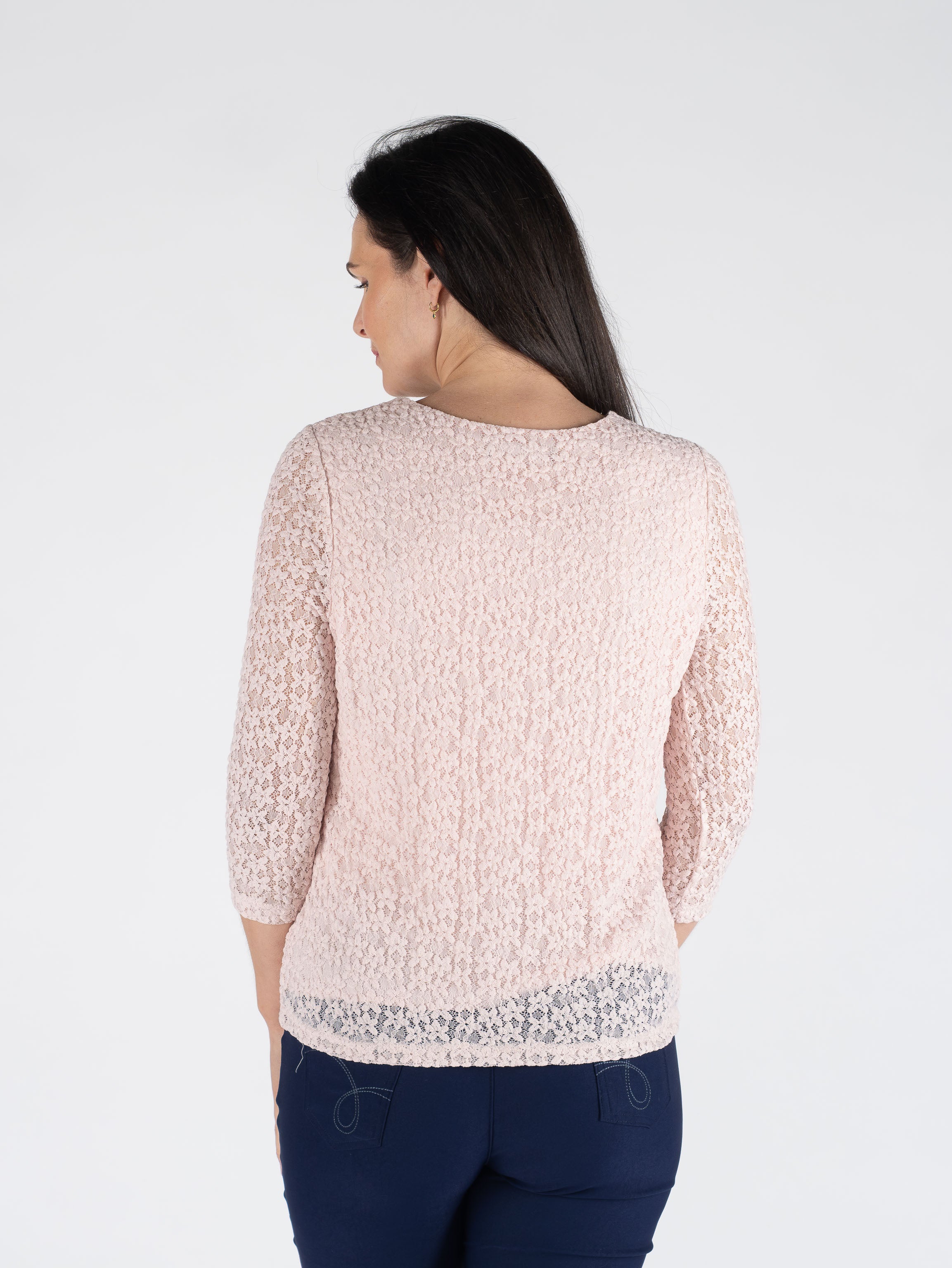This delicate pink round neck lace top perfectly combines feminine elegance with everyday versatility. The soft round neckline frames the face beautifully, while the intricate lace overlay adds a romantic, textured touch. Designed with 3/4 sleeves, it provides graceful coverage for both daytime and evening occasions. Crafted from a comfortable blend of 95% polyester and 5% elastane, the fabric offers gentle stretch for a flattering fit that moves with you.