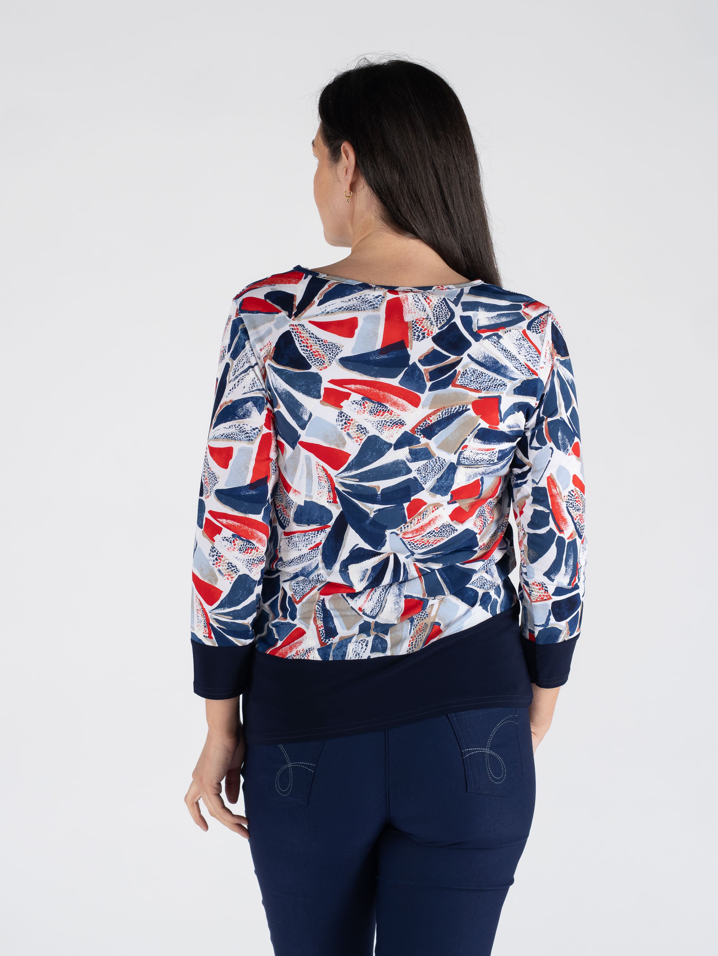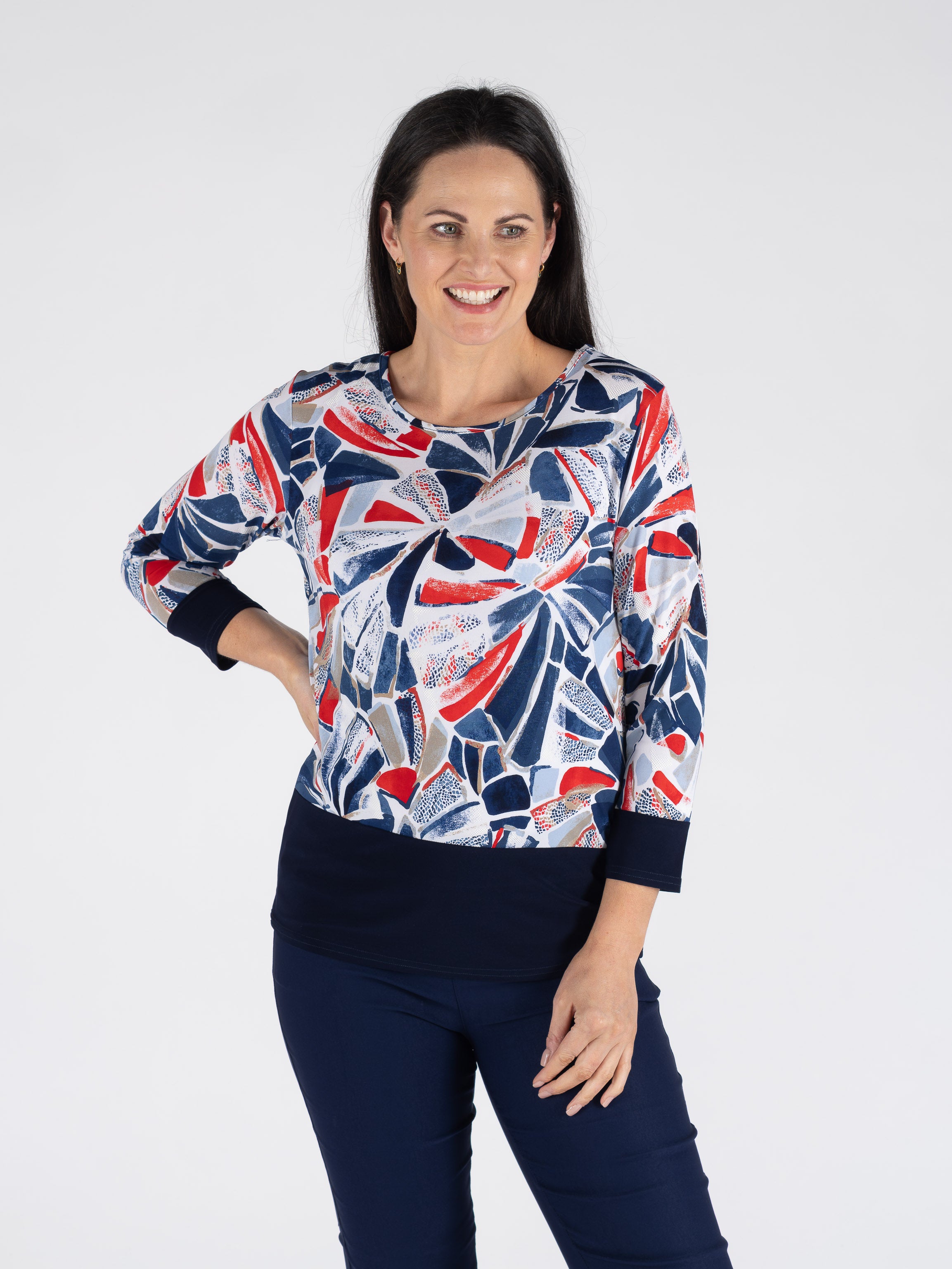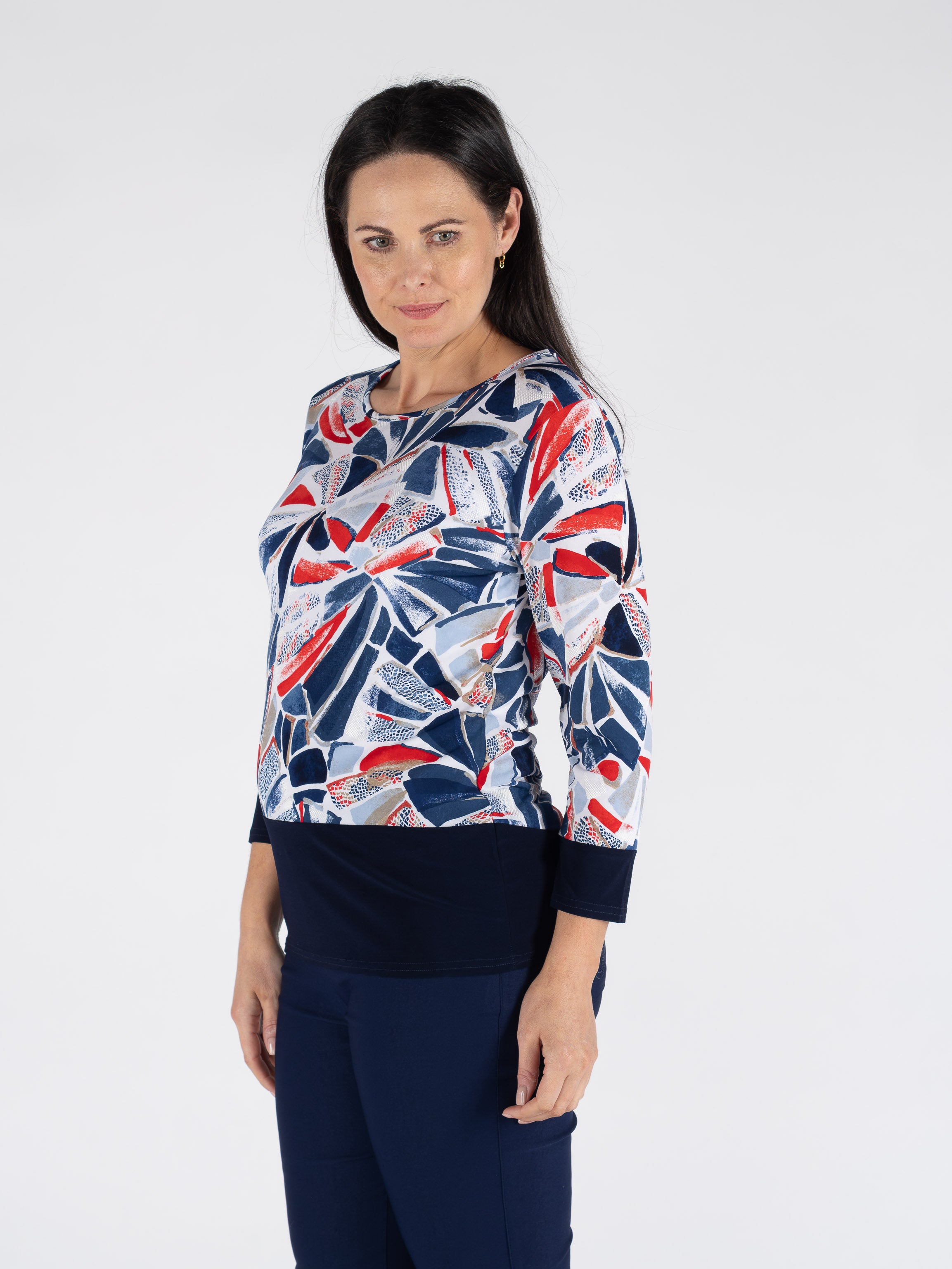 SWIRLY BLOCK PRINT TOP CONTRAST PANEL 3/4 SLEEVE