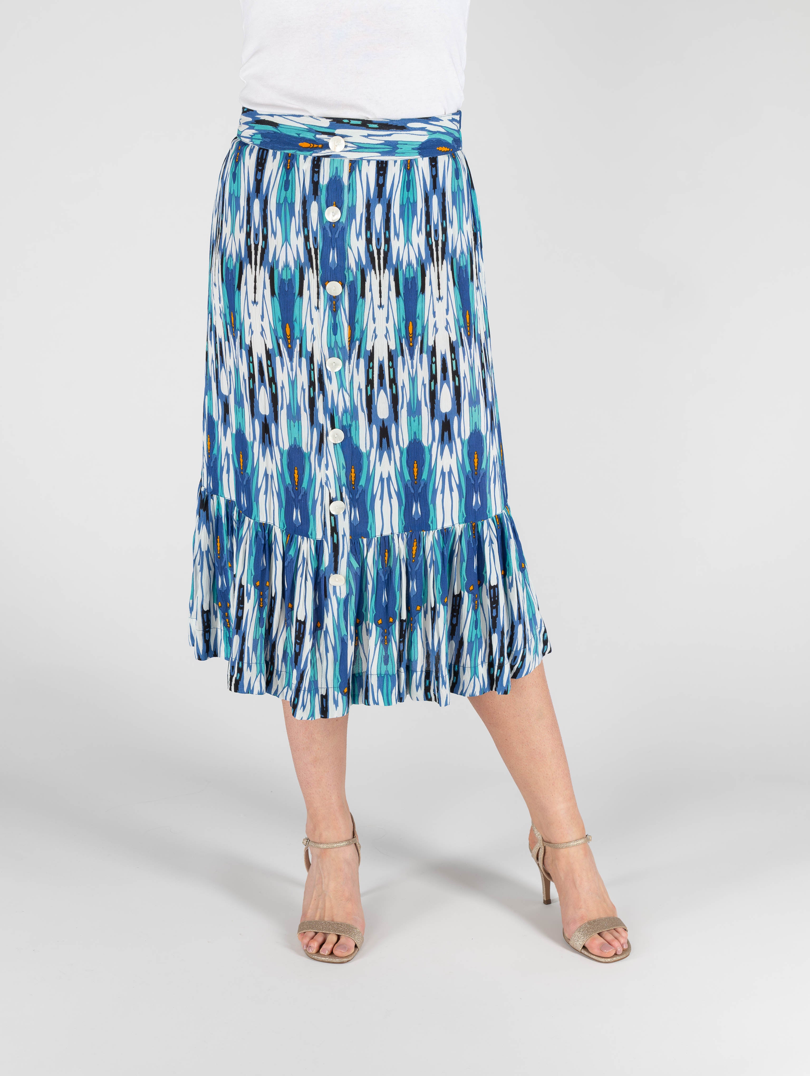 TURQ PRINT FRONT BUTTON CRINKLE SKIRT BOTTOM FRILL