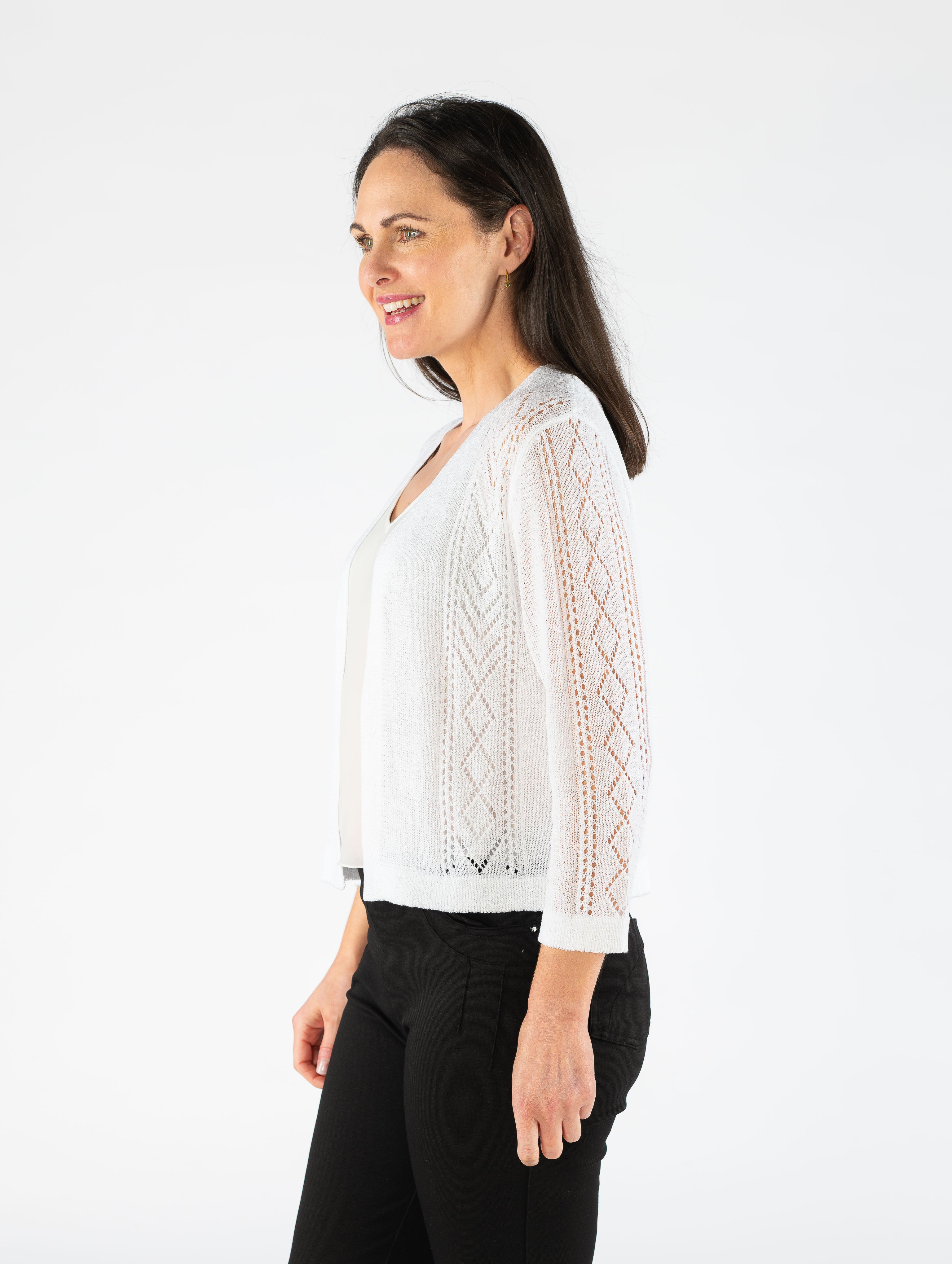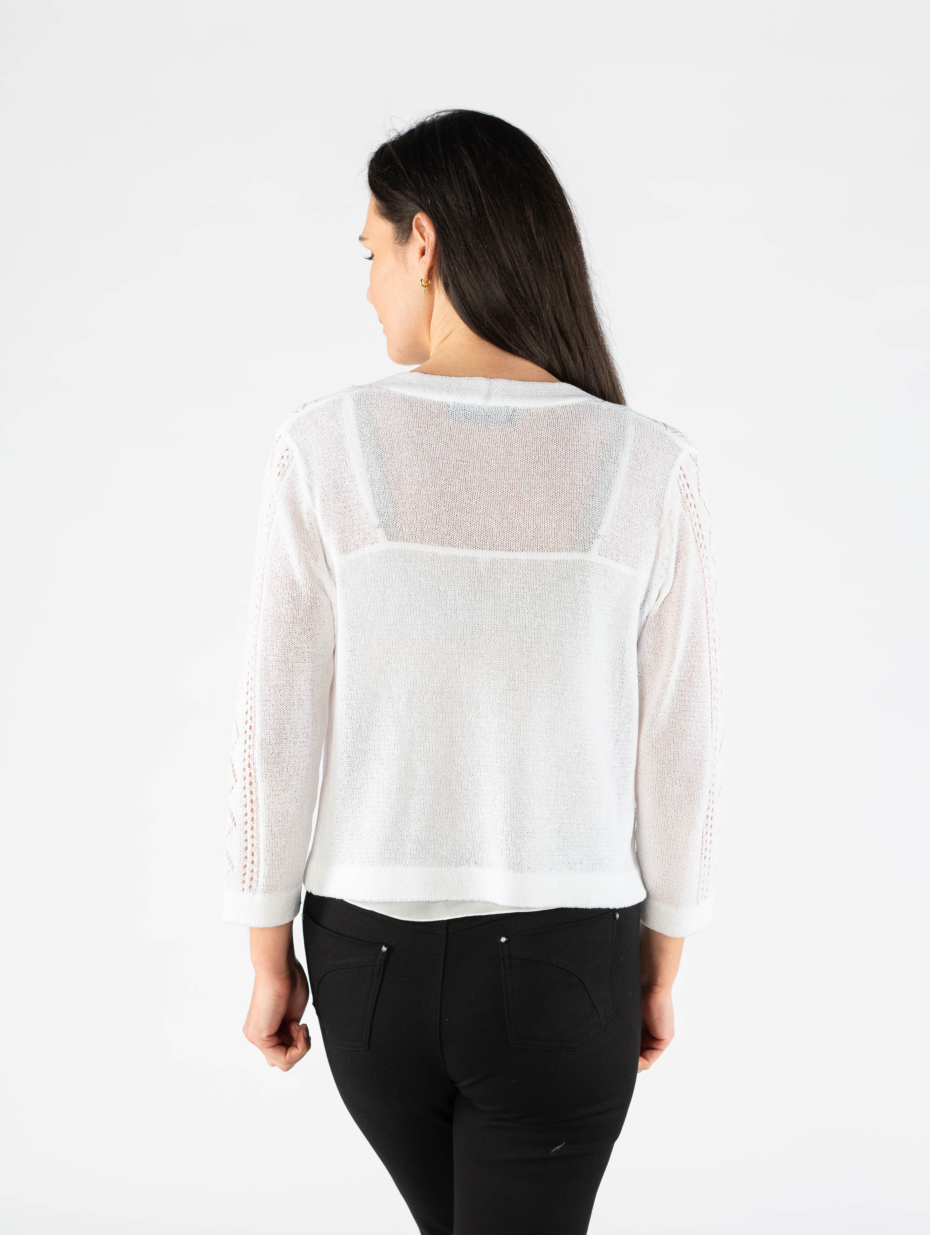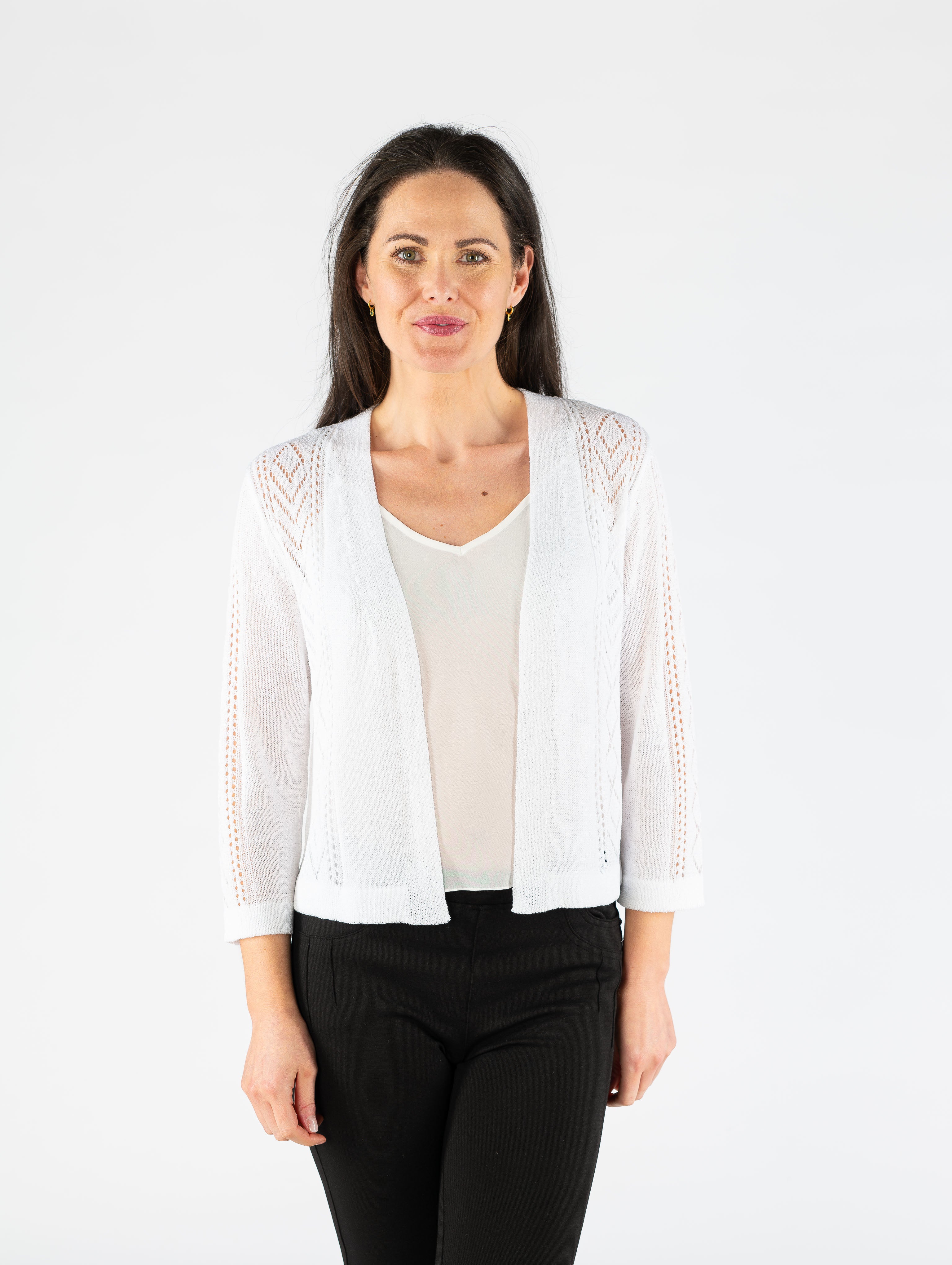 White edge to edge patterned shrug with 3/4 sleeve