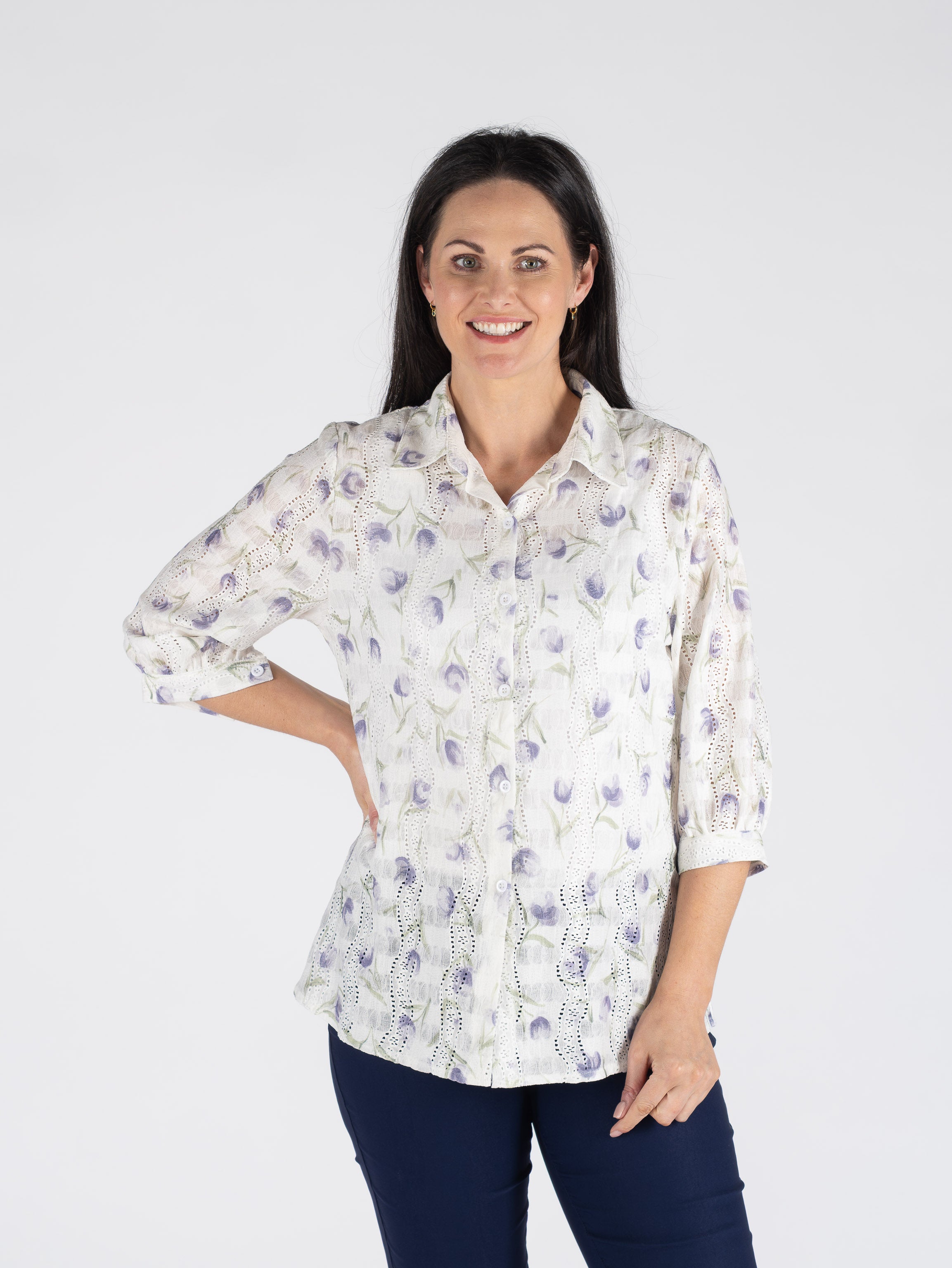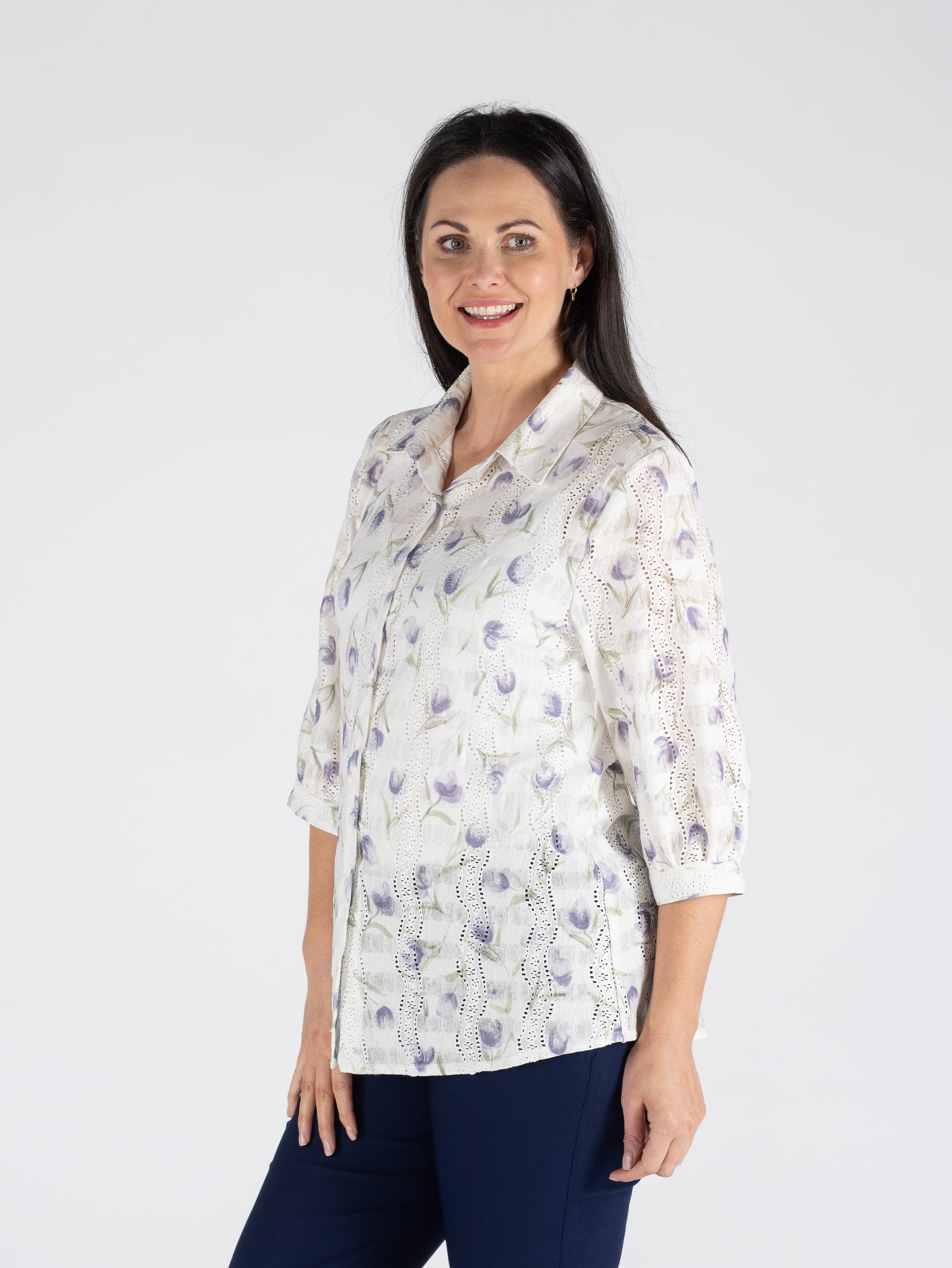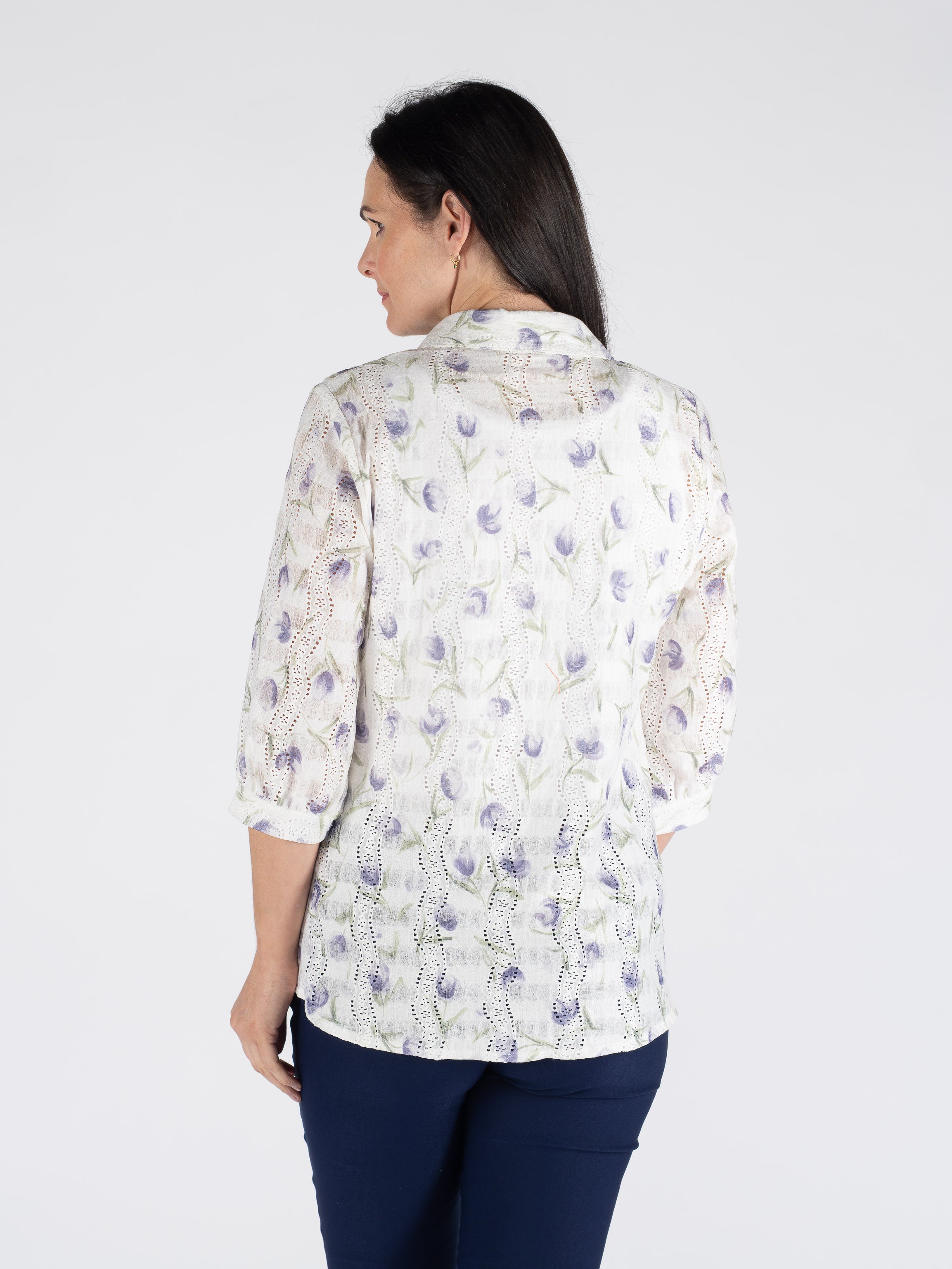 WHITE LILAC PRINTED SCHIFFLY BLOUSE 3/4 SLEEVE